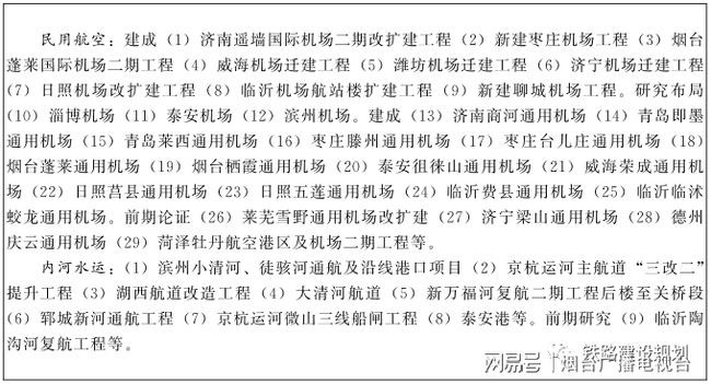 一、构建互联互通综合运输通道。对接国家综合交通布局,统筹铁路、航空、公路、水路、城市轨道等交通方式,提升完善北部沿海、济青、鲁中、鲁南等东西通道功能,提高东部沿海、京沪辅助、滨临、京沪、京九等南北通道效能,打造陆海统筹、空地联动、能力充分的“四横五纵”综合运输通道。
