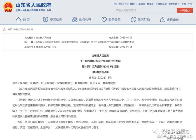 4月25日,《山东省省国民经济和社会发展第十四个五年规划和2035年远景目标纲要》全文在山东省人民政府网站发布。