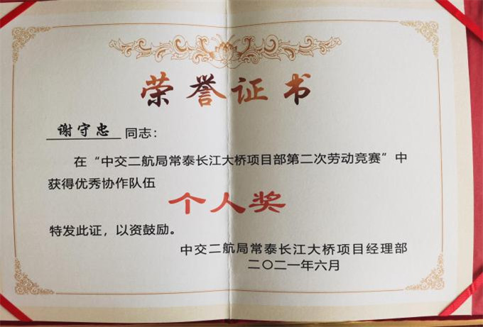 6月5日,中交二航局授予易通特基第七项目公司常泰长江大桥项目部“优秀协作队伍”二等奖及项目部员工谢守忠“个人奖”荣誉称号。