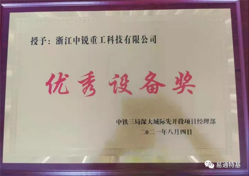 8月5日,鉴于中锐重工科技有限公司ZG70液压抓斗在深圳机场至大亚湾城际深圳机场至坪山段工程先开段项目的出色表现。中铁三局授予浙江中锐重工科技有限公司“优秀设备奖”荣誉称号。