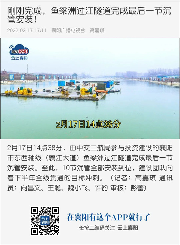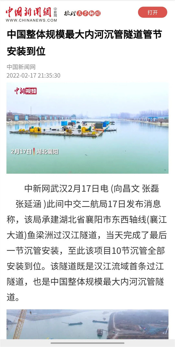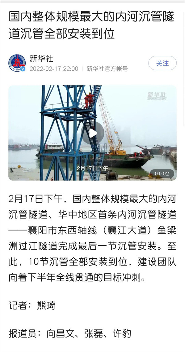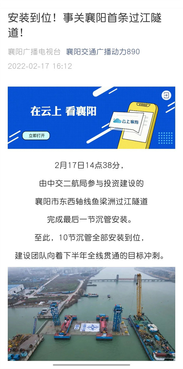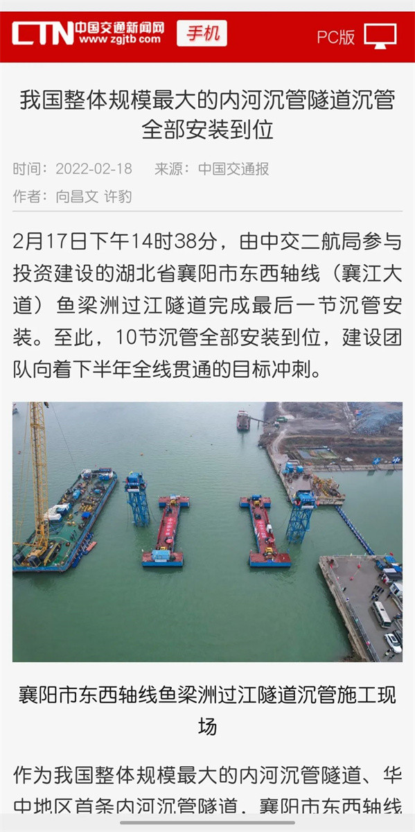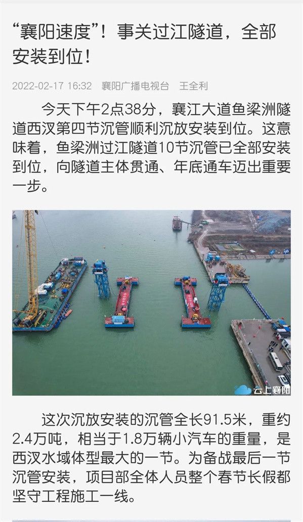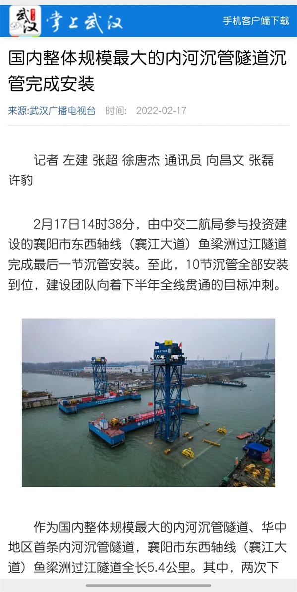近日,由中交二航局参与投资建设的国内整体建设规模最大的内河沉管隧道项目——襄阳市东西轴线(襄江大道)鱼梁洲段过江隧道沉管全部完成安装。该消息受到《人民日报》、新华社、央视网等中央媒体、行业媒体以及地方媒体的关注,部分报道摘录如下: