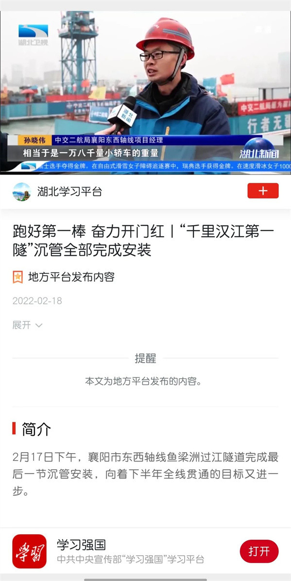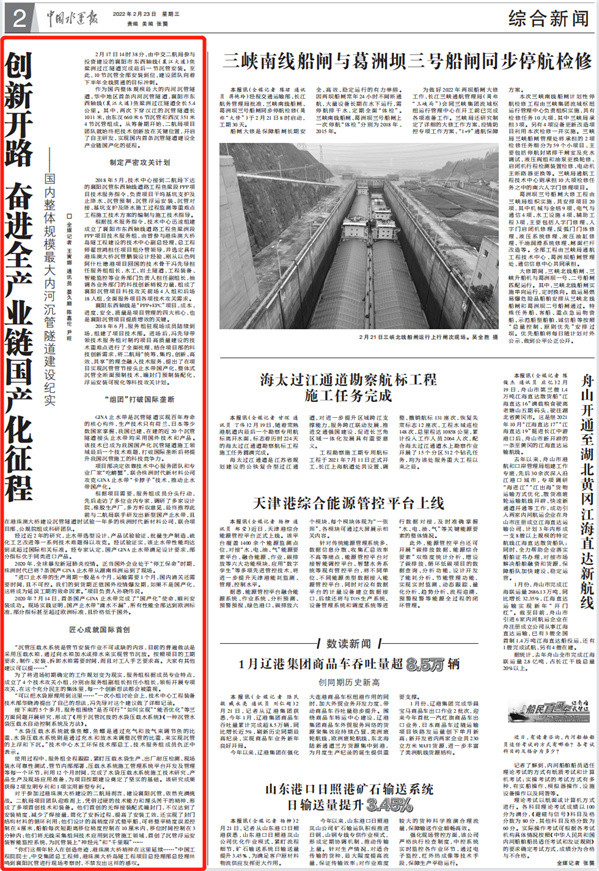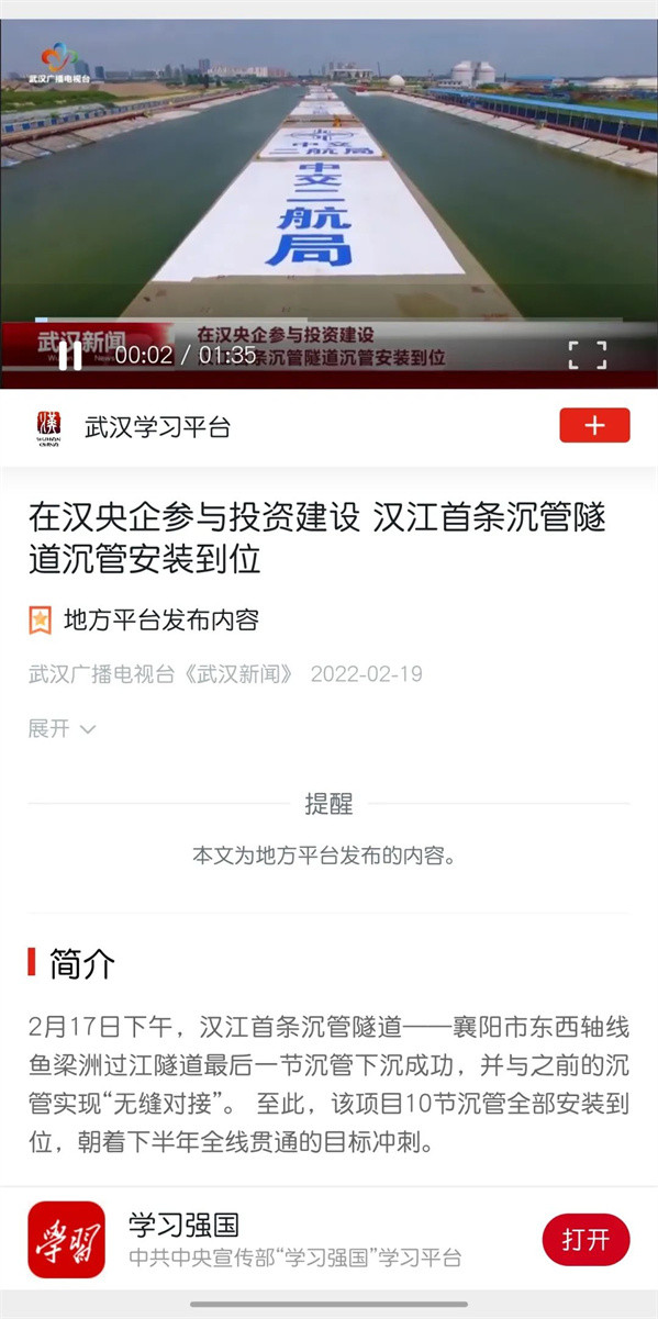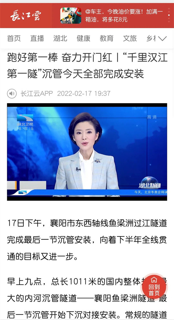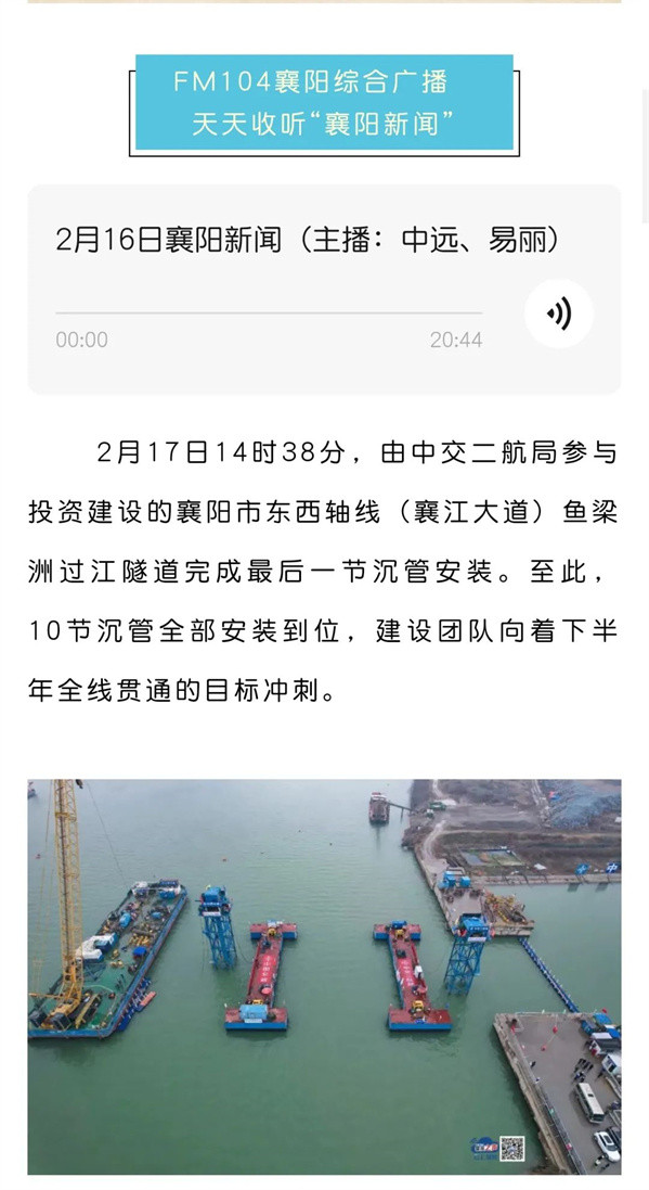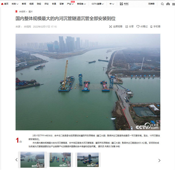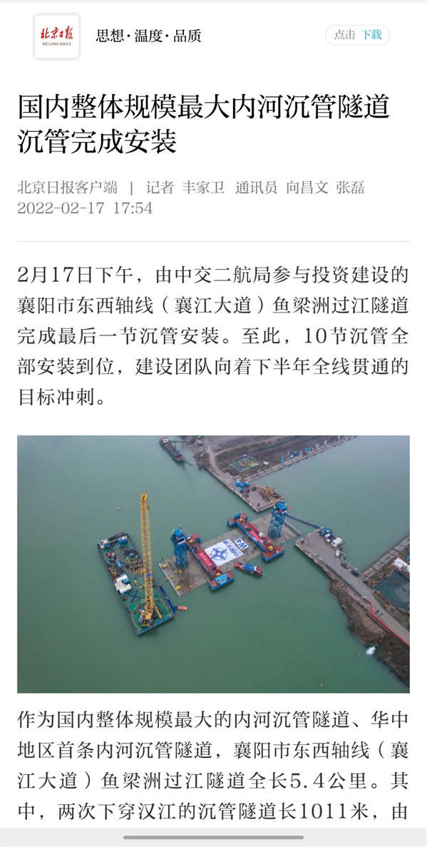 近日,由中交二航局参与投资建设的国内整体建设规模最大的内河沉管隧道项目——襄阳市东西轴线(襄江大道)鱼梁洲段过江隧道沉管全部完成安装。该消息受到《人民日报》、新华社、央视网等中央媒体、行业媒体以及地方媒体的关注,部分报道摘录如下: