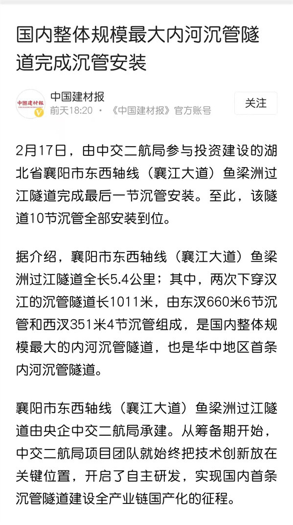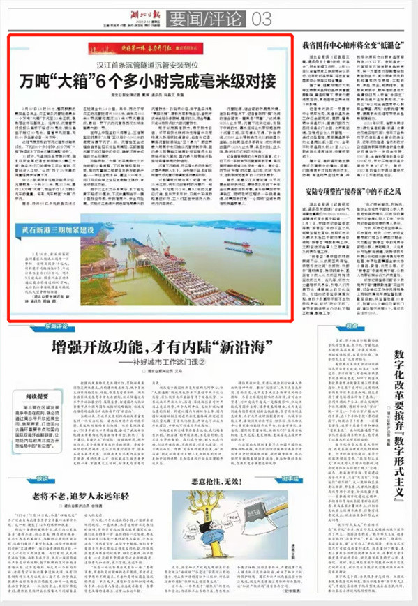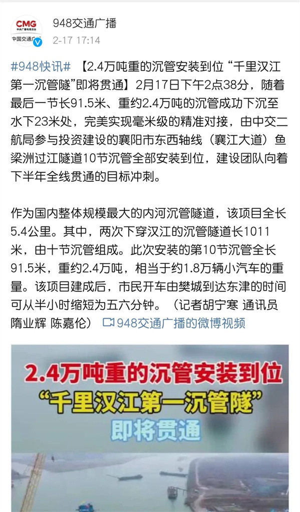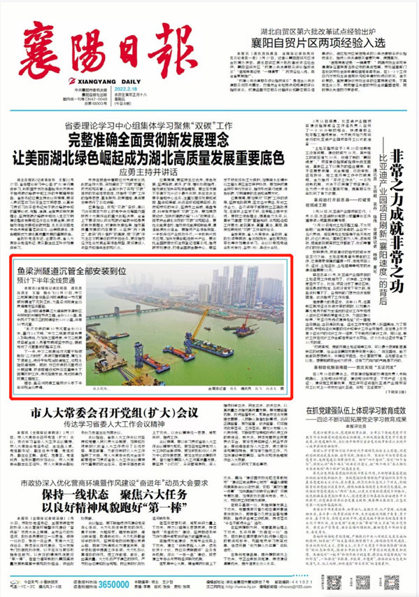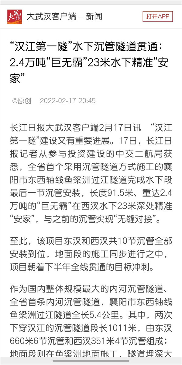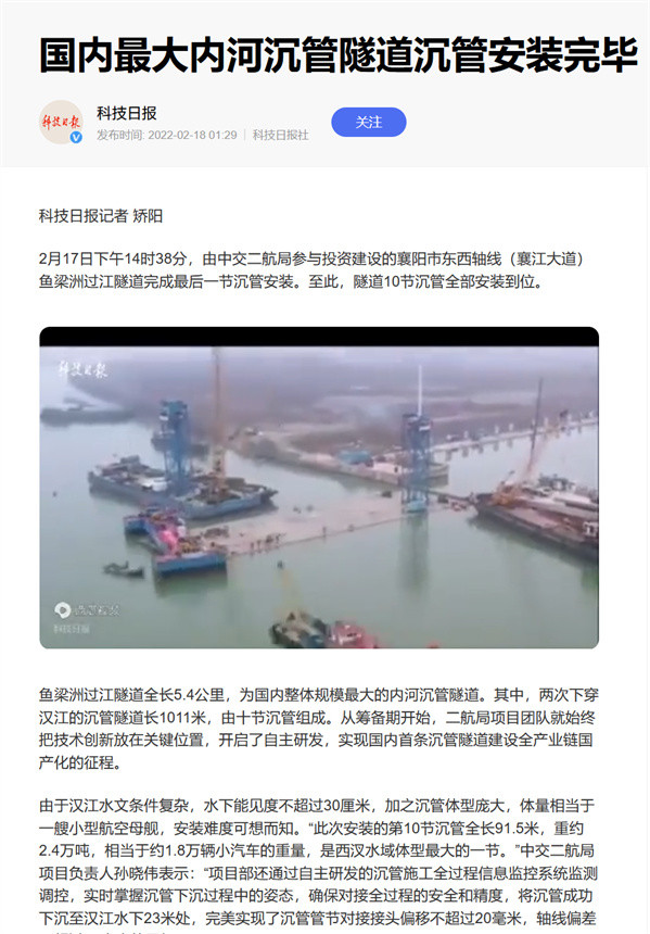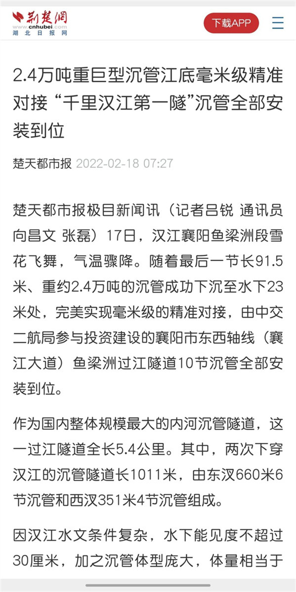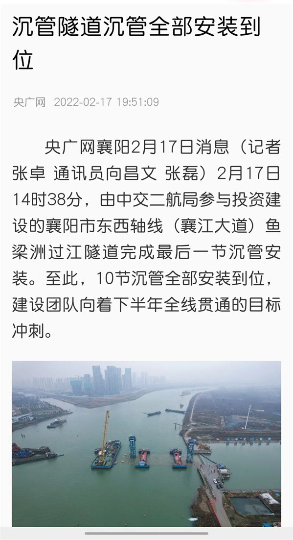 赞!中交二航局投资建设的襄阳市东西轴线项目沉管全部完成安装引《人民日报》等多家媒体关注!