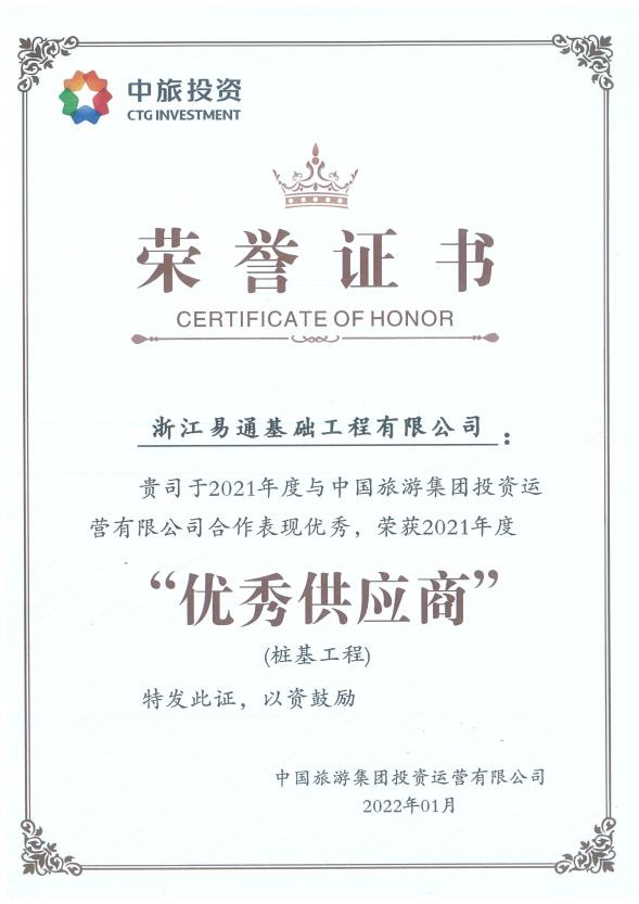4月13日,中国旅游集团投资运营有限公司供应商大会在宁波市杭州湾举行。会上,中旅投资对在2021年有作出重要贡献的合作企业进行表彰。浙江易通特种基础工程有限公司获评“2021年度优秀分包商(桩基工程)”殊荣。