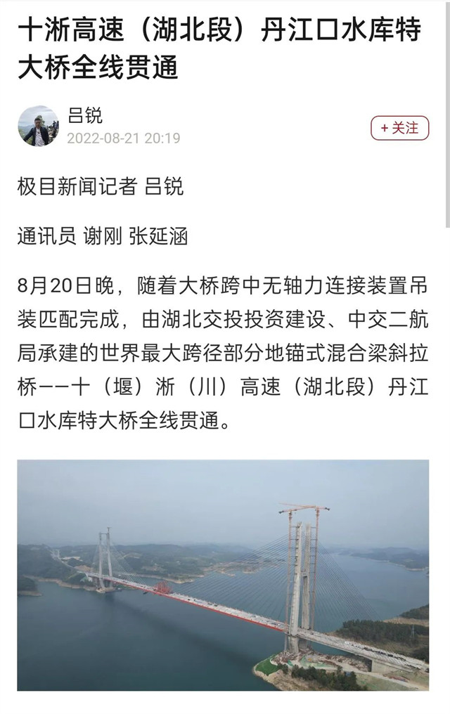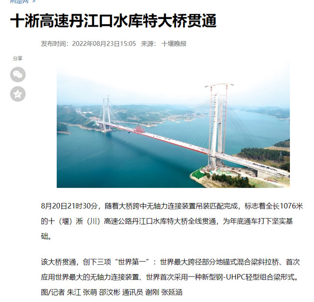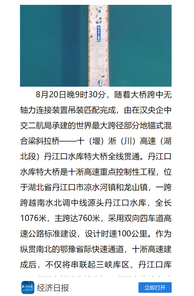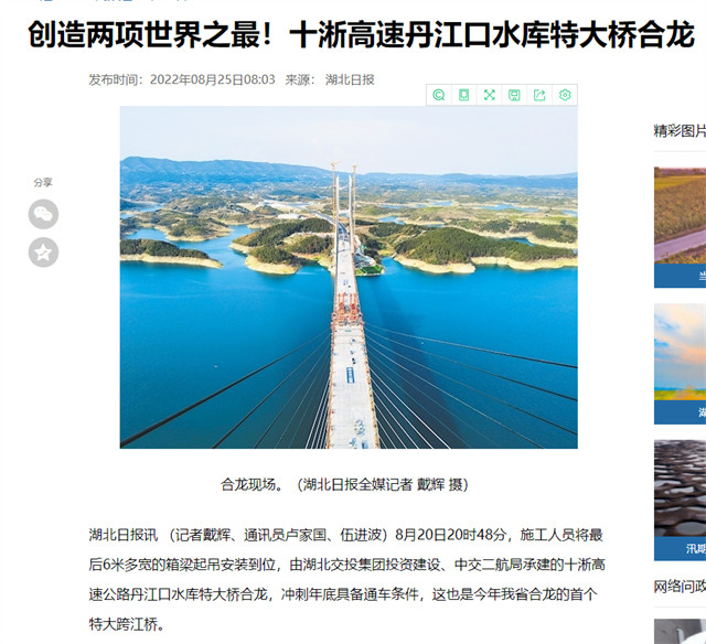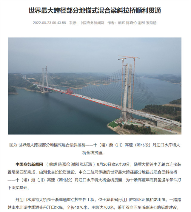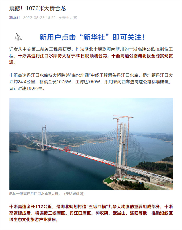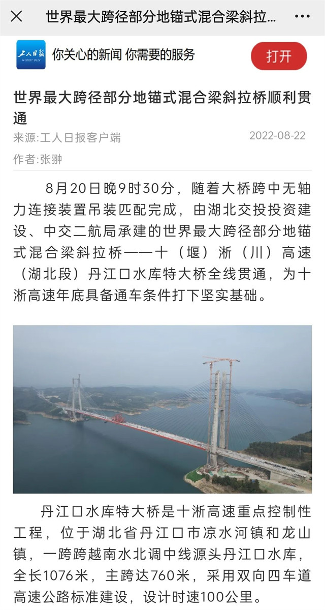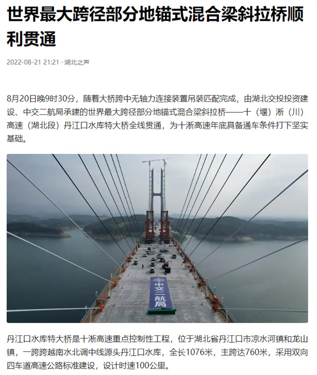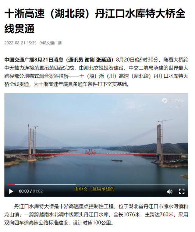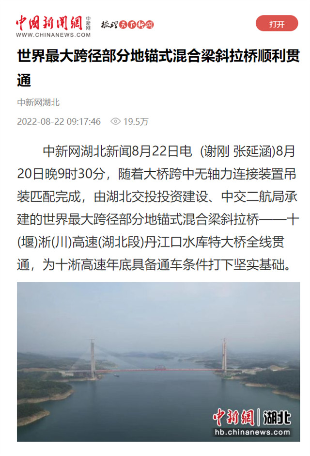 8月20日,由中交二航局承建的世界最大跨径部分地锚式混合梁斜拉桥 ——十淅高速公路丹江口水库特大桥顺利贯通。该消息受到《人民日报》、新华社、中央广播电视总台等中央媒体、行业媒体以及地方媒体的关注,部分报道摘录如下: