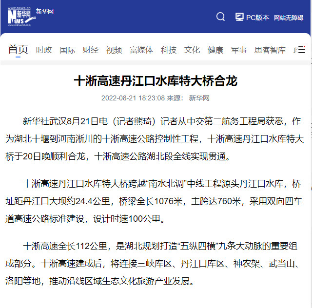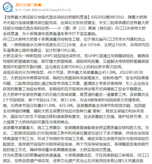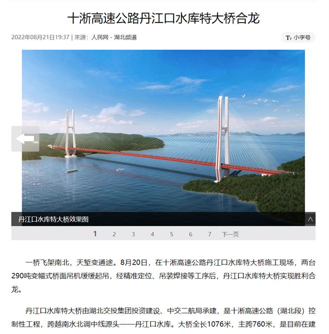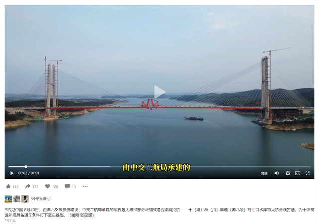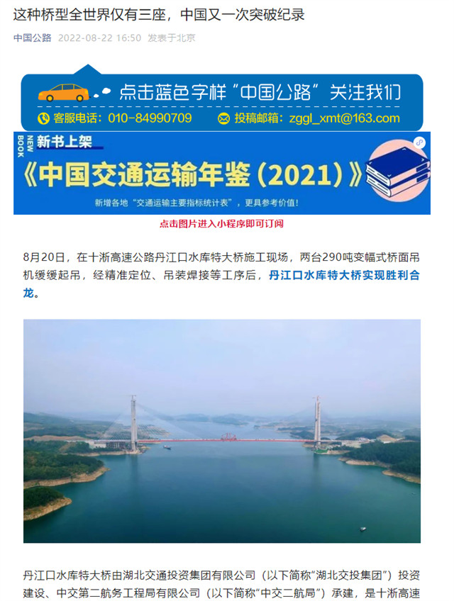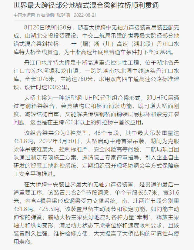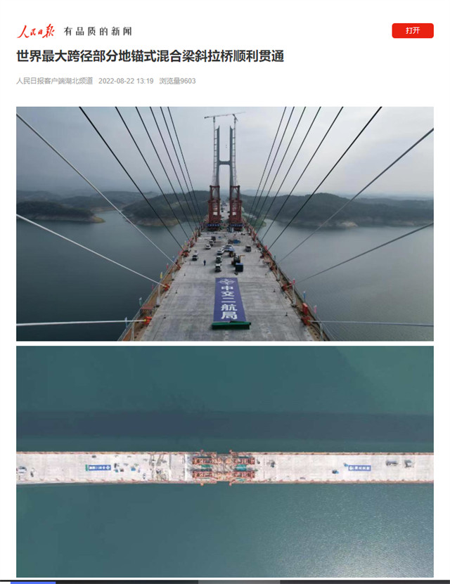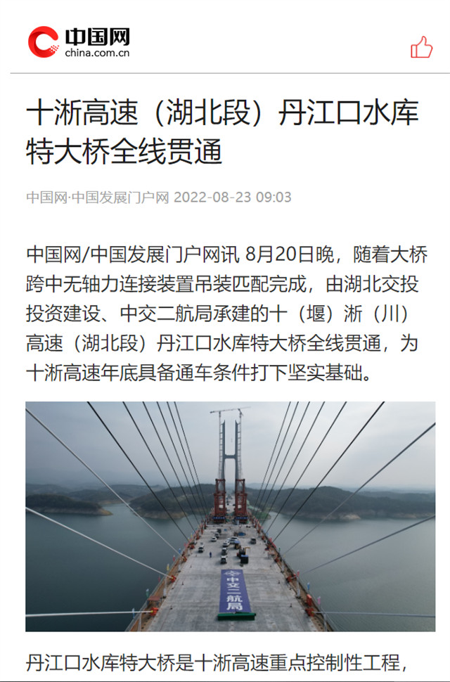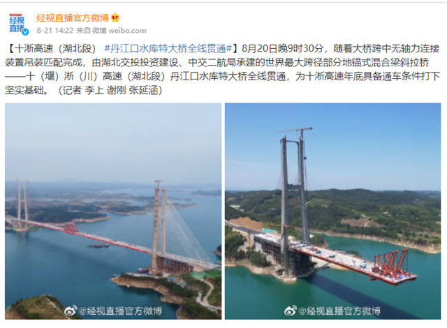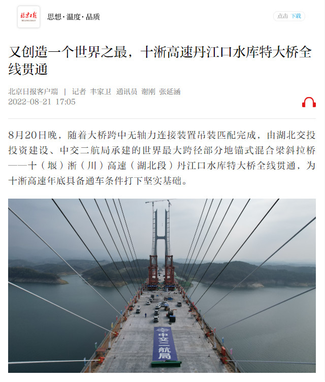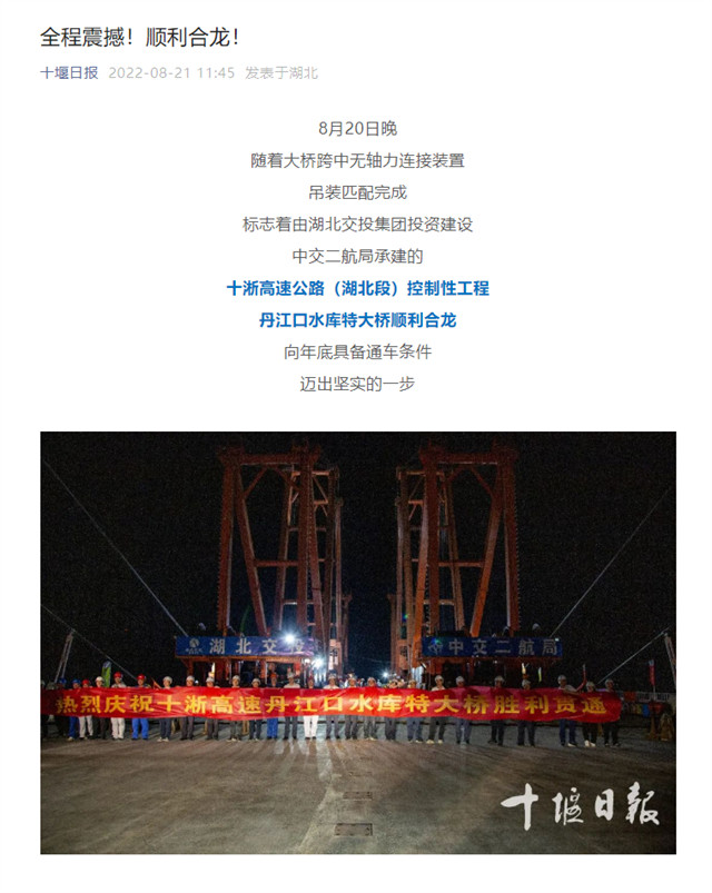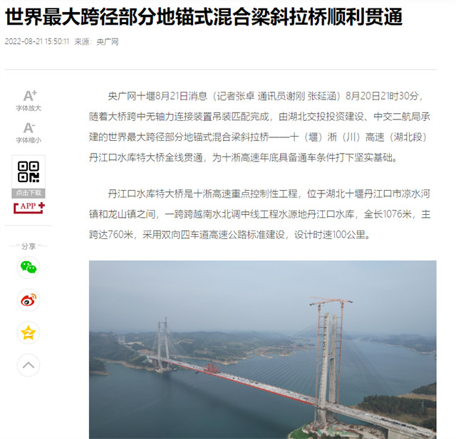 8月20日,由中交二航局承建的世界最大跨径部分地锚式混合梁斜拉桥 ——十淅高速公路丹江口水库特大桥顺利贯通。该消息受到《人民日报》、新华社、中央广播电视总台等中央媒体、行业媒体以及地方媒体的关注,部分报道摘录如下: