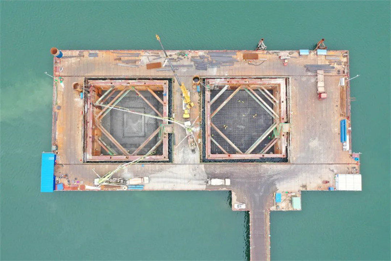 此次浇筑的是主墩左幅承台,累计浇筑混凝土约5100立方米,分两层浇筑。为确保大体积混凝土浇筑质量,项目团队提前谋划,制定了详细的专项施工方案,对人员配备、机械配置、监控检测、安全管控等方面作了周密安排。施工中,承台采取水平分层、纵向分段的浇筑形式,从四周向中心推进,严格控制分层厚度,按标准实施每道工序,并设置冷却水管强化温控,防止混凝土因水化热引起结构裂缝,确保整体浇筑质量。9月8日,历经36小时连续浇筑,项目团队顺利完成首层混凝土浇筑;9月18日,历经32小时连续浇筑,完成第二层混凝土浇筑,为后续施工奠定了坚实基础。