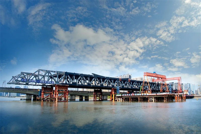 经过反复比选,最终主桥钢桁梁采用“步履机+滑块”顶推法施工,该方法也是大体量钢桁梁顶推施工中首次成功应用。大桥钢结构总重达6.2万吨,大桥顶推总重最大达4.3万吨,分8轮次拼装顶推完成。