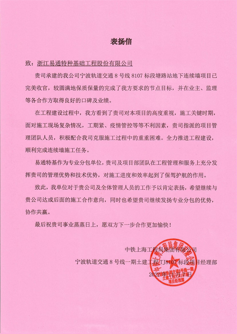 11月7日,中铁上海工程局集团有限公司发来表扬信函。来函表示,在施工过程中,易通特基岩土二分公司宁波8107标段塘站项目团队,克服施工现场情况复杂、工期紧、疫情管控等不利因素,并充分发挥团队管理优势和技术优势,对施工进度和效率起到了保驾护航的作用,在业主、监理等各合作方取得了良好的口碑及业绩。