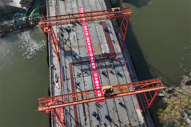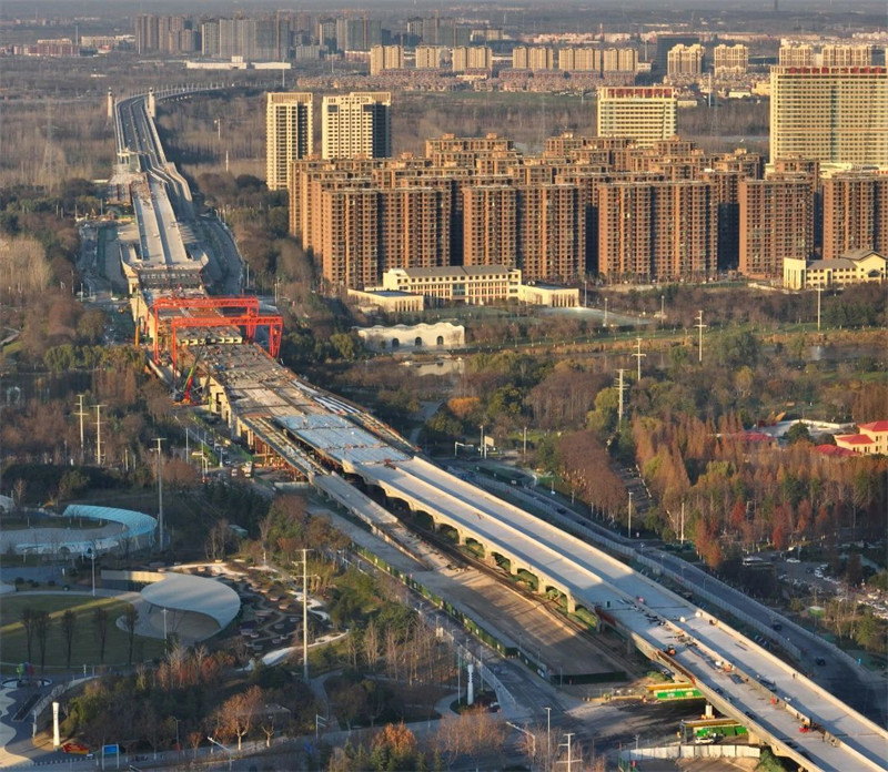 随着古黄河桥最后一片钢箱梁吊装到位,工程主线桥成功合龙,实现主线高架主体结构贯通。