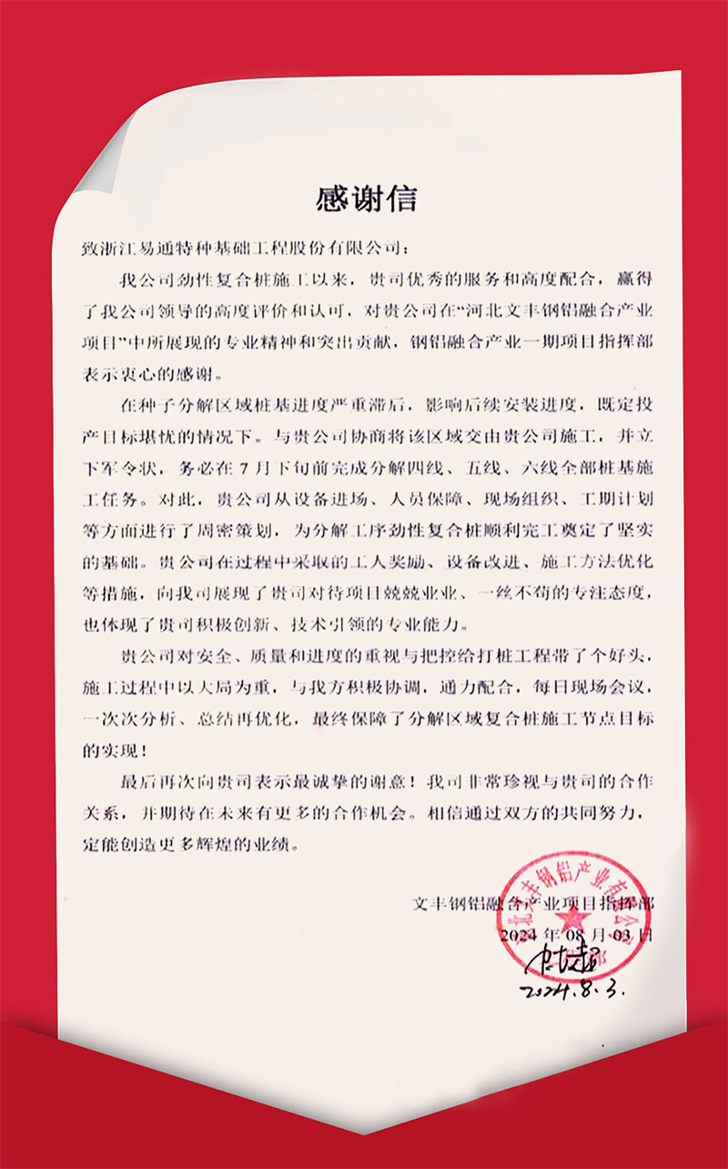 信中对我司在“河北文丰钢铝融合产业项目”施工中多方面(质量、安全、进度等)杰出表现表示肯定,同时就我司在项目中所展现的专业精神和突出贡献表示感谢,并授予我司“先进单位”和“优秀班组”的称号。