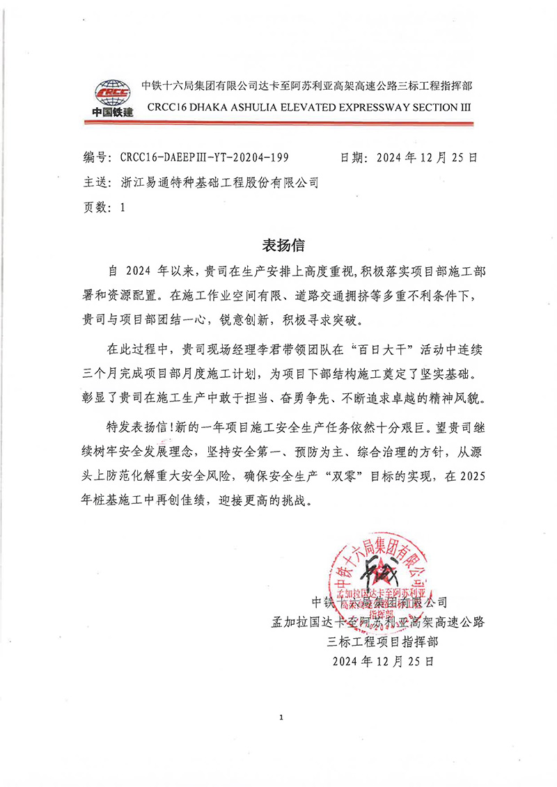 易通孟加拉项目公司收到中铁十六局表扬信