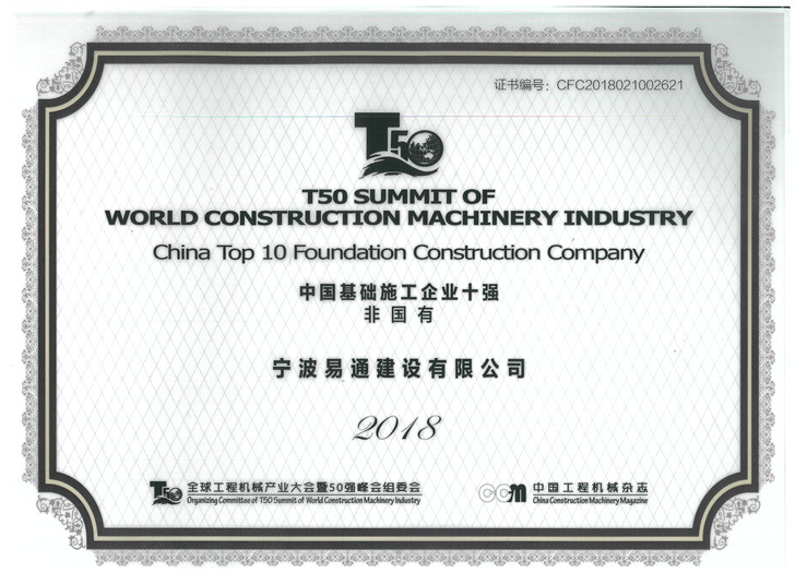 近日,由全球工程机械产业大会主办的第二届中国基础施工企业百强大会在上海召开。备受瞩目的“中国基础施工企业十强”榜单重磅揭晓。公司凭借扎实的业绩、创新能力和综合实力荣膺十强榜单。公司董事长王慧荣、总经理陈保才出席盛会并领奖。