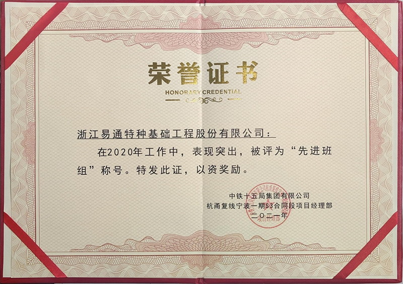 2021年3月,中铁十五局授予浙江易通特种基础股份工程有限公司2020年度“先进班组”称号。